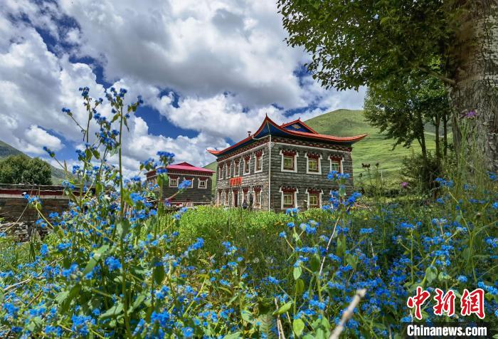 藏式民居旁盛開的小藍(lán)花。劉忠俊 攝