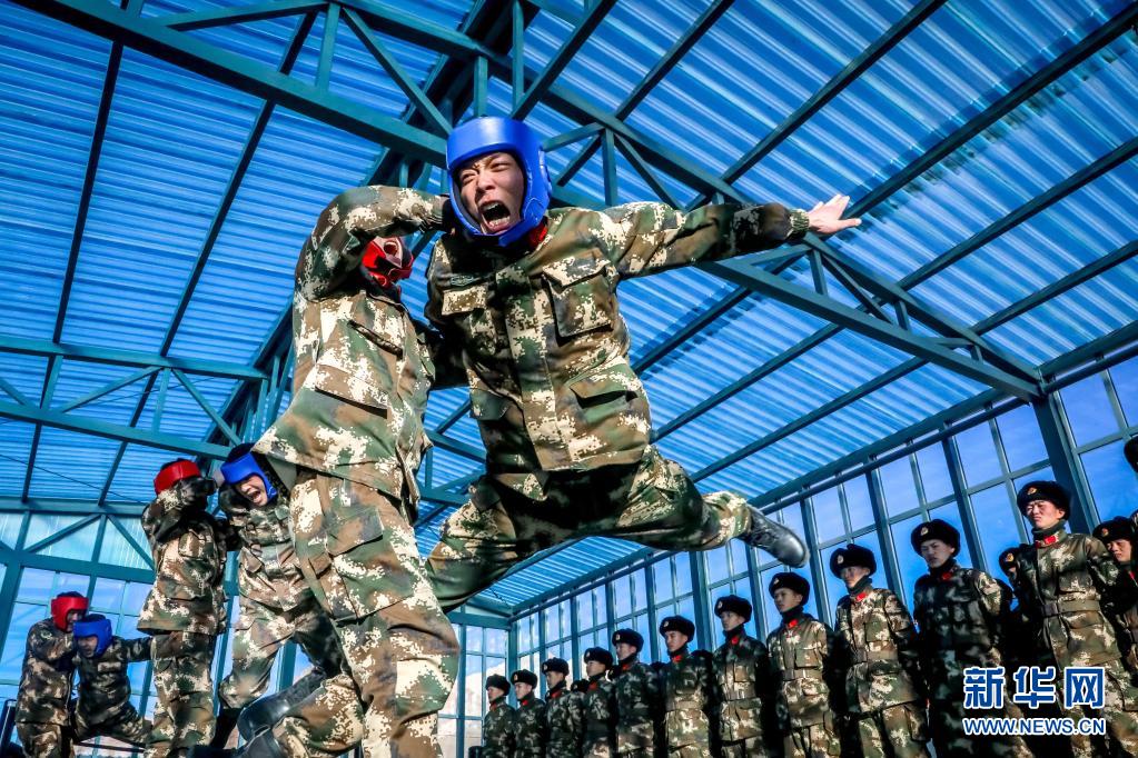 武警青海總隊執(zhí)勤支隊執(zhí)勤七中隊官兵在訓練館訓練(2月1日攝)。新華社 楊浩 攝