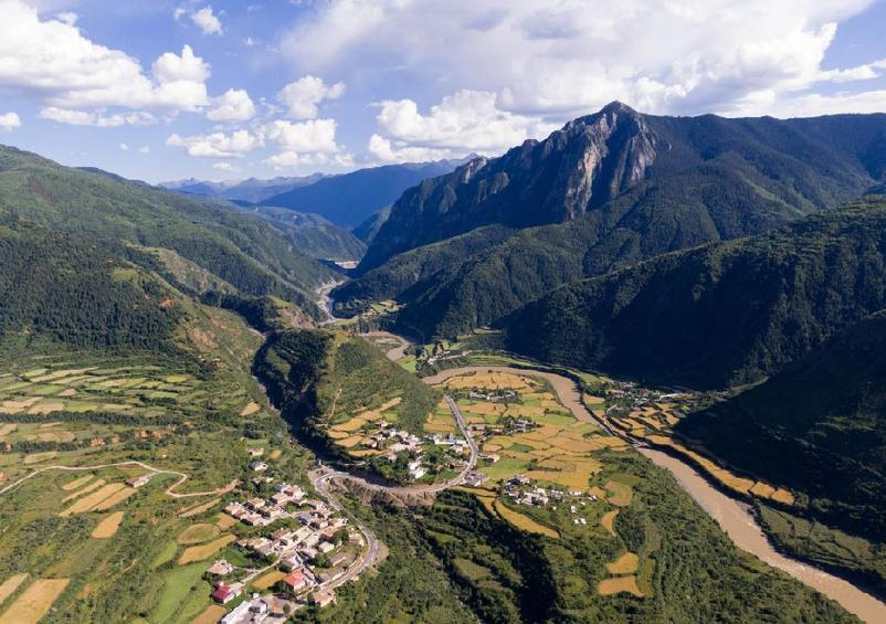 在道孚縣瓦日鄉(xiāng)瓦日村,俯瞰鮮水河谷兩岸的風(fēng)光(7月23日攝,無人機(jī)照片)。新華社記者 江宏景 攝