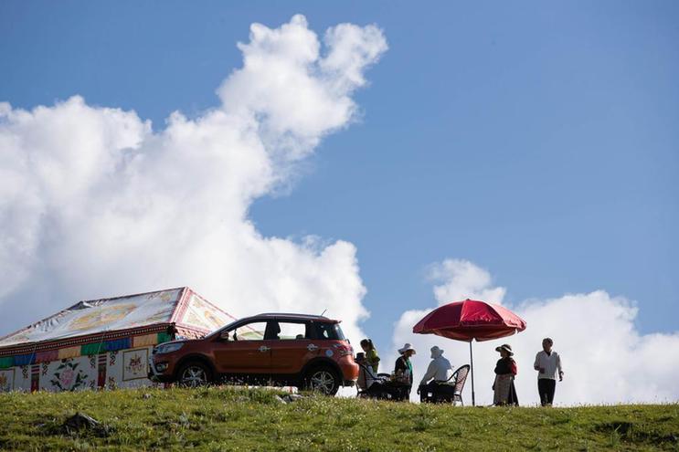 7月25日,在道孚縣鮮水鎮(zhèn),人們?cè)诓菰闲蓍e。新華社記者 江宏景 攝