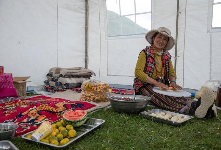 7月25日,在道孚縣龍燈草原,牧民在帳篷里做包子。新華社記者 劉夢(mèng)琪 攝