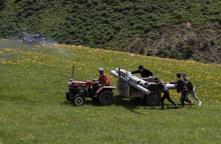 7月25日,在道孚縣龍燈草原,牧民在運(yùn)輸水泥電線桿。新華社記者 劉夢(mèng)琪 攝