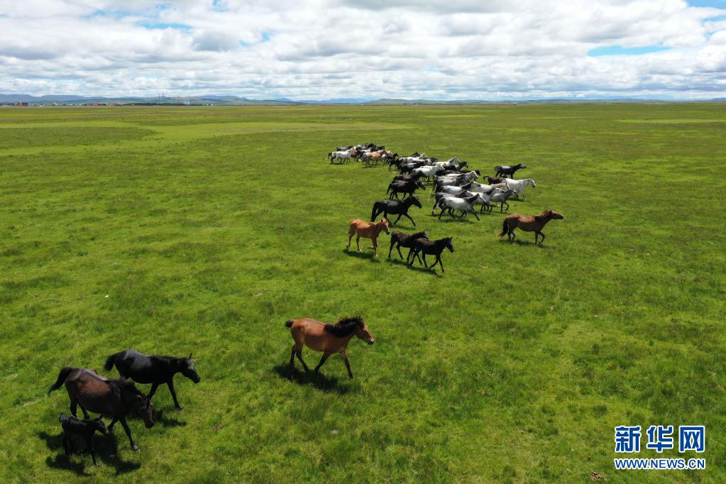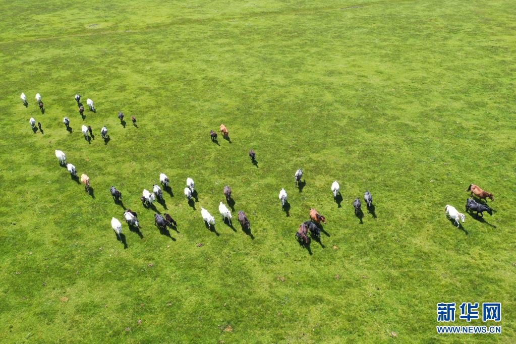 這是7月15日在甘肅瑪曲縣河曲馬場(chǎng)拍攝的河曲馬(無(wú)人機(jī)照片)。 新華社記者 杜哲宇 攝