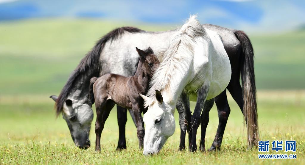 這是7月15日在甘肅瑪曲縣河曲馬場(chǎng)拍攝的河曲馬。新華社記者 杜哲宇 攝