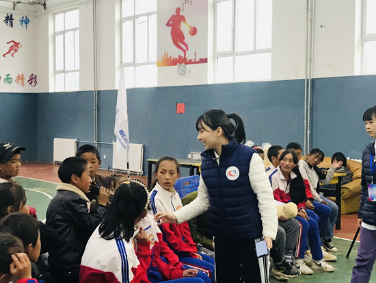 給孩子上課的6名小老師都來自“同心·共鑄中國(guó)心”青海果洛行成長(zhǎng)營(yíng)公益項(xiàng)目,均是志愿者子女,平均年齡18歲。