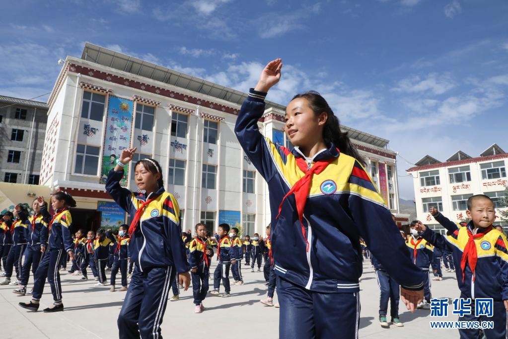 9月2日,黃南藏族自治州同仁市熱貢藝術(shù)完全小學的學生在跳“鍋莊”課間操。新華社記者 馬千里 攝