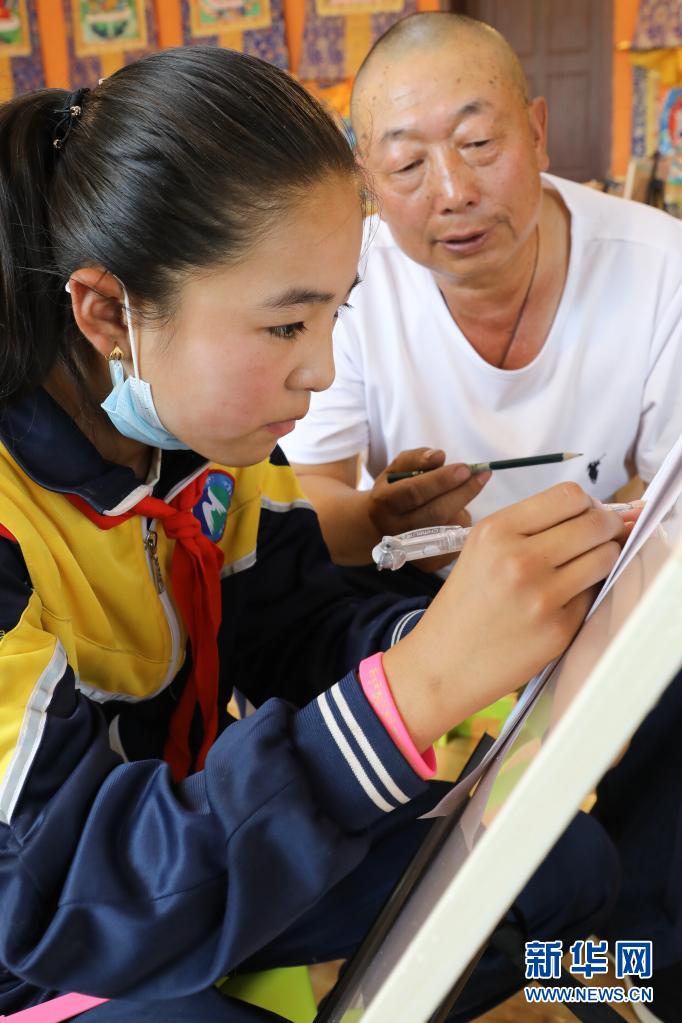 9月2日,黃南藏族自治州同仁市熱貢藝術(shù)完全小學六年級學生才讓央宗在唐卡繪畫老師旦巴的指導下畫畫。新華社記者 馬千里 攝
