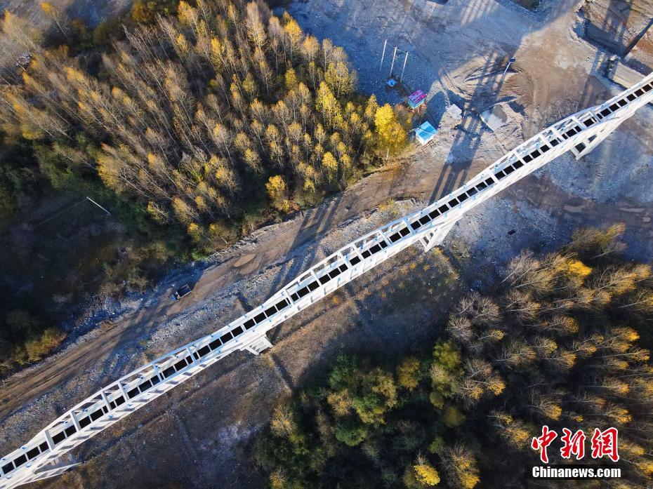 10月16日,航拍青海省海南藏族自治州貴德縣拉西瓦灌溉工程中建設(shè)的渡槽。(無人機(jī)照片) 中新社記者 馬銘言 攝