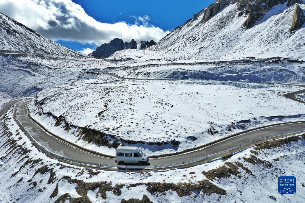 10月23日,一輛汽車行駛在四川省甘孜藏族自治州巴塘縣境內(nèi)的藏巴拉雪山的公路上(無人機照片)。新華社記者 劉坤 攝