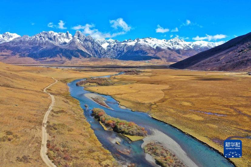 這是10月24日在措普溝景區(qū)內(nèi)拍攝的章德草原和扎金甲博神山。新華社記者 劉坤 攝