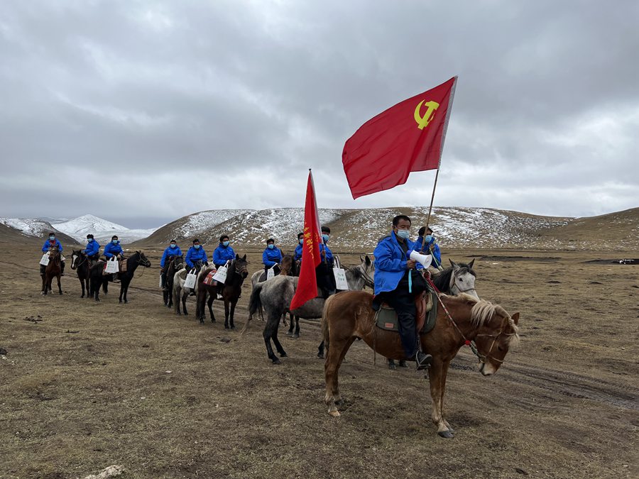 “每年冬季,牧民就會(huì)轉(zhuǎn)場到冬季牧場,牧區(qū)的道路常年被風(fēng)雪覆蓋,車輛難以通行,只能由我們騎著馬到每家每戶進(jìn)行宣講?!比识喱敶逦瘯?huì)副主任道吉塔說,為了將黨的政策第一時(shí)間傳遞給牧民群眾,當(dāng)?shù)氐穆?lián)戶長、牧民群眾組建了馬隊(duì)前往牧區(qū)進(jìn)行宣講,牧民群眾親切地稱他們?yōu)椤榜R背宣講隊(duì)”。
