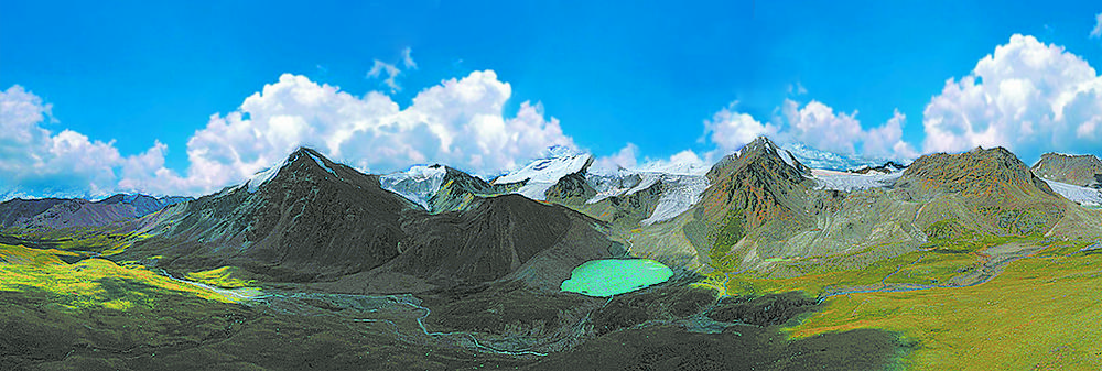 遠(yuǎn)眺索布查葉,山脈頂部云霧環(huán)繞,山坡上青翠欲滴,山腳下無(wú)數(shù)銀鏈般的細(xì)流在廣袤的草地上開(kāi)枝散葉。