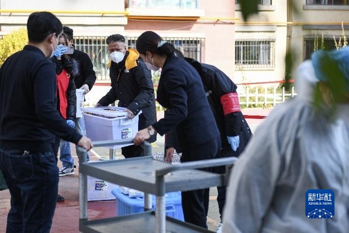 來到一臨時核酸采樣點,羅宗周帶領(lǐng)工作人員分發(fā)愛心餐,邊囑咐邊環(huán)抱著5箱酸奶吃力地往前走,“這里有60名工作人員,需要10份清真餐,一箱酸奶12盒,一定把數(shù)量點夠,別少了。”