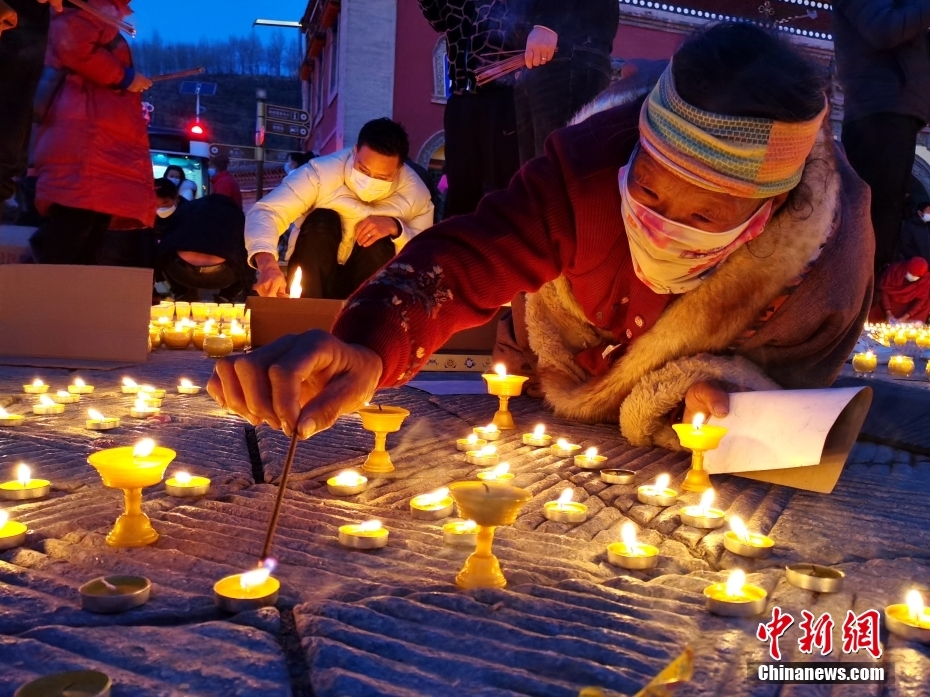 記者在塔爾寺內(nèi)看到,裹著藏袍的藏傳佛教信眾,扶老攜幼,在寺院山門處的標志性建筑八寶如意塔周圍的地面燃燈,并在高原冷風中虔誠守護。