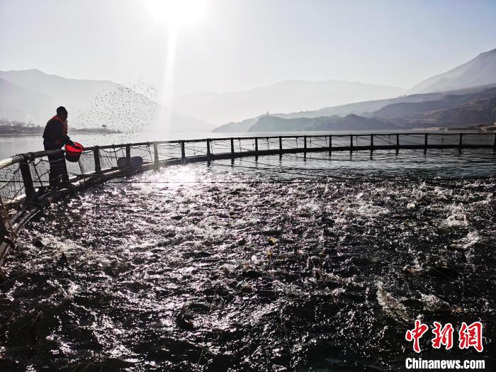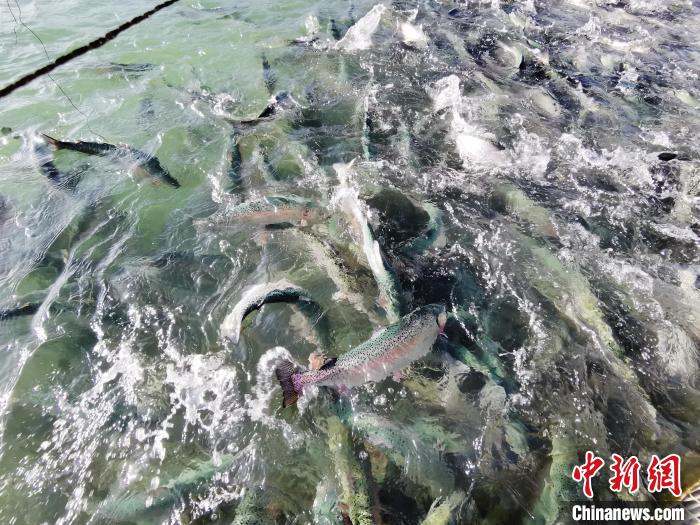 圖為尖扎縣黃河水面養(yǎng)殖網(wǎng)箱里的鮭鱒魚?!?zhí)砀?攝