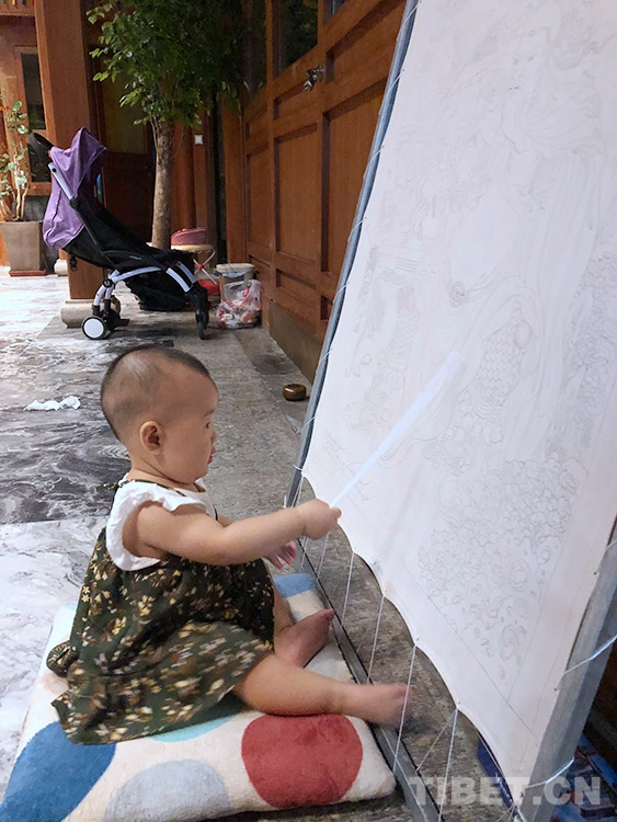 仁青多杰自己也有兩個(gè)女兒,大女兒已經(jīng)快五歲了,受家庭環(huán)境熏陶,從會(huì)走路時(shí)起,就喜歡拿毛筆,也非常喜歡畫(huà)畫(huà)。仁青多杰和父親每天都在畫(huà)畫(huà),有一次在北京,仁青多杰的一幅唐卡快要完成了,女兒趁著中午大人們吃飯的間歇,跑出去拿著毛筆和顏料自己畫(huà)。那幅畫(huà)仁青多杰一直保留在北京,準(zhǔn)備等女兒長(zhǎng)大后送給她。