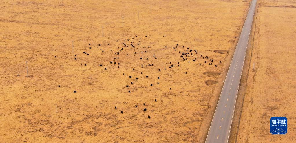 3月31日,在青海省黃南藏族自治州河南蒙古族自治縣,一群牦牛在草原上吃草(無人機(jī)照片)。新華社記者 王艷 攝