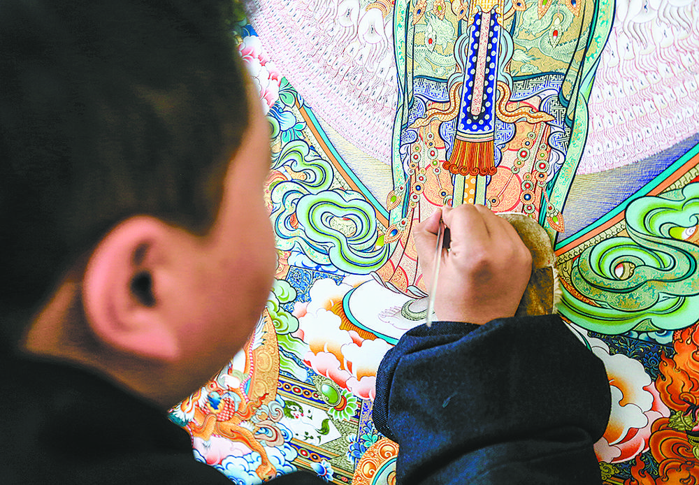 “唐卡”,被譽(yù)為世界上最繁瑣的工筆畫,圖為熱貢畫師繪制唐卡局部。