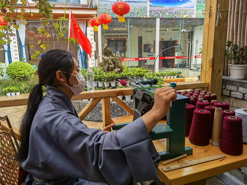 2022年5月12日,“5·12”汶川特大地震抗震救災14周年紀念日,山鷹帶著幾個員工來到漁子溪,在汶川縣黨委、映秀鎮(zhèn)黨委、漁子溪村兩委及當?shù)厝罕姷臒崆閹椭拢e辦了“藍措馬”品牌圍巾展示活動。村里還積極幫助他們尋找合適的房屋作為編織車間,讓他們先在漁子溪站住腳。