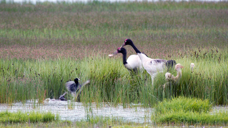 祁連山國家公園里黑頸鶴一家的幸福生活