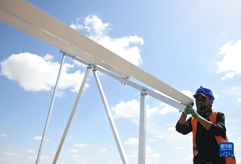 6月8日,工人在國家能源集團海南基地共和縣100萬千瓦牧光儲二期20萬千瓦建設(shè)項目施工。新華社記者 張龍 攝