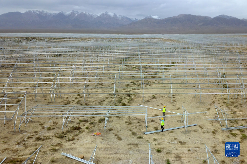 6月7日,在國(guó)家電投集團(tuán)黃河公司德令哈220萬(wàn)千瓦多能互補(bǔ)項(xiàng)目一期100萬(wàn)千瓦光伏項(xiàng)目建設(shè)現(xiàn)場(chǎng),工人在安裝光伏支架。新華社記者 王浡 攝