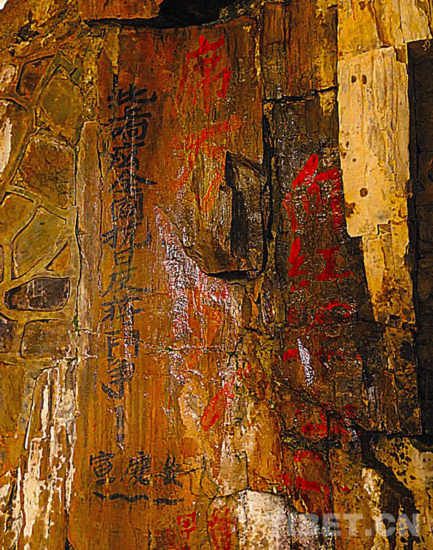 圖為一九三五年七月,中國工農(nóng)紅軍二方面軍第六軍團在長征途中,曾路過班瑪、久治一帶,并在班瑪絨玉地區(qū)的森林石壁上刻下的“北上響應(yīng)全國抗日反蔣斗爭”的標語