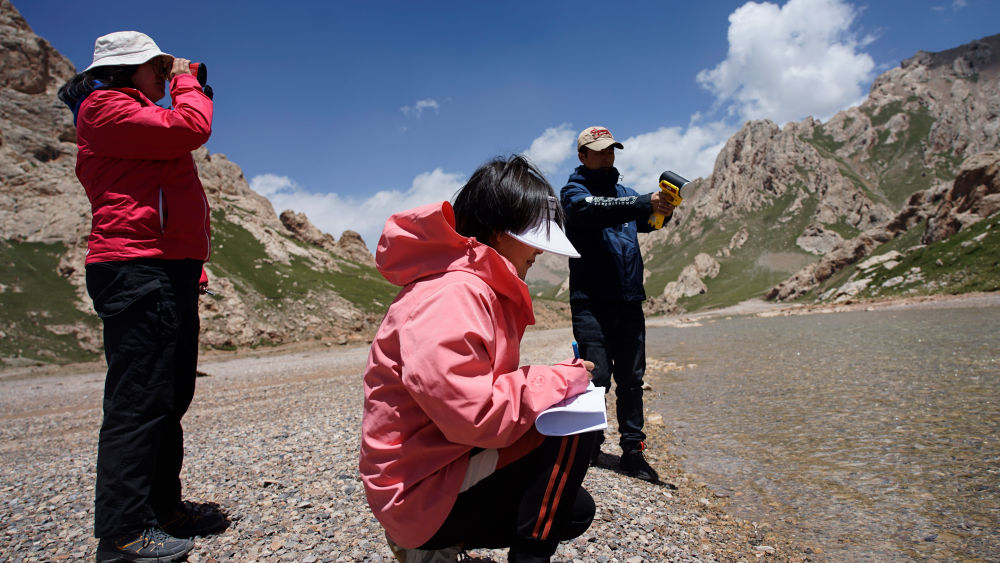 7月27日,來自青海省水文水資源測報(bào)中心的江源科考隊(duì)員在測量河流流速和記錄數(shù)據(jù)。新華社 陳杰 攝