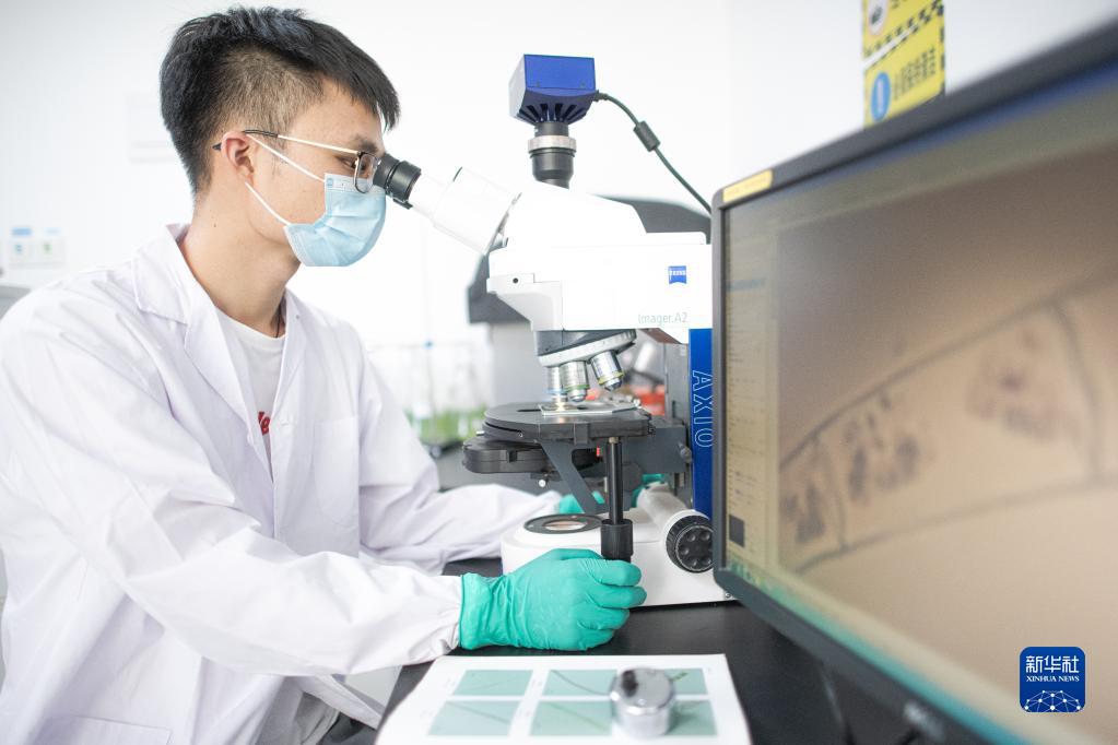 8月3日,在長江科學院實驗室,科研人員對長江源區(qū)采集的藻類樣本進行鑒定。 新華社記者 肖藝九 攝
