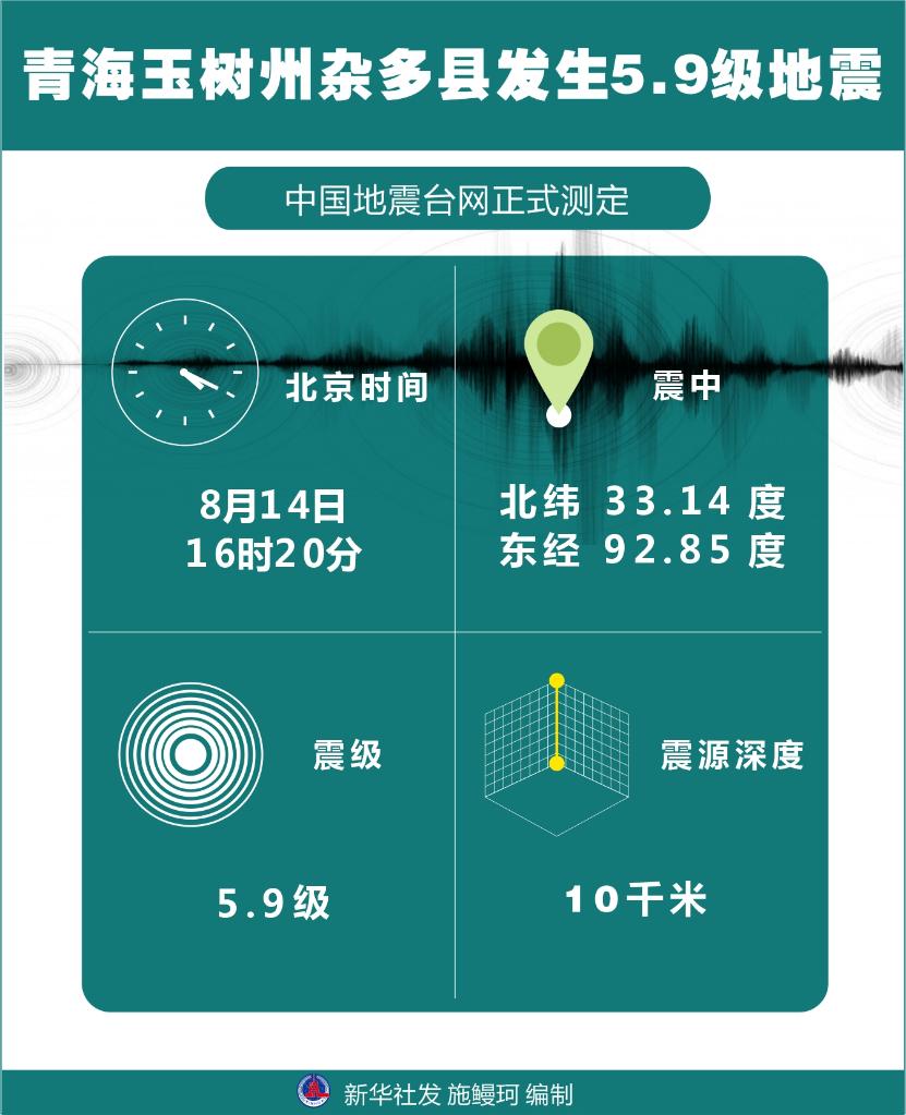 記者從青海省地震局獲悉,8月14日16時20分,青海省玉樹藏族自治州雜多縣發(fā)生5.9級地震,震源深度10千米,震中位于北緯33.14度、東經92.85度。目前,暫無人員傷亡消息。