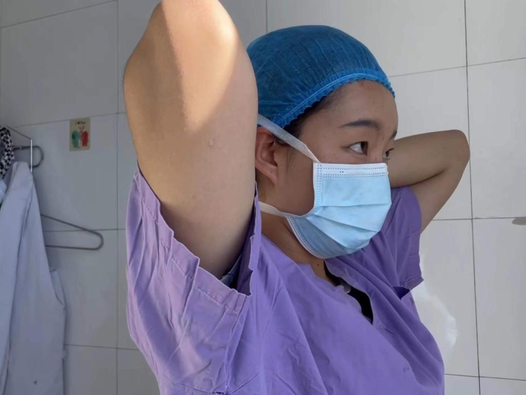 “第一回進手術(shù)室,非常緊張!”桑周拉毛換好手術(shù)服后,對著鏡子把頭發(fā)扎緊。然后,她按照手術(shù)室麻醉醫(yī)生的要求,把耳邊的碎發(fā)一絲不茍地塞進帽子,然后轉(zhuǎn)身走進了手術(shù)室。
