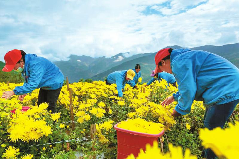 進(jìn)入8月,在四川省涼山州木里藏族自治縣喬瓦鎮(zhèn)簸箕籮村木里縣農(nóng)業(yè)產(chǎn)業(yè)示范園里,150畝的金絲皇菊像一塊巨大的金色地毯鋪在田野上。“現(xiàn)在正是金絲皇菊的采收時(shí)節(jié),村民們的腰包又要鼓起來(lái)了!”木里縣委書(shū)記高峰說(shuō)。