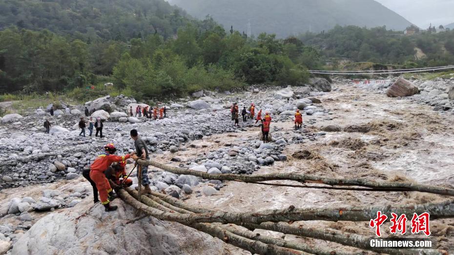 群眾和森林消防員正在搭建簡易過河木橋。四川森林消防供圖 攝