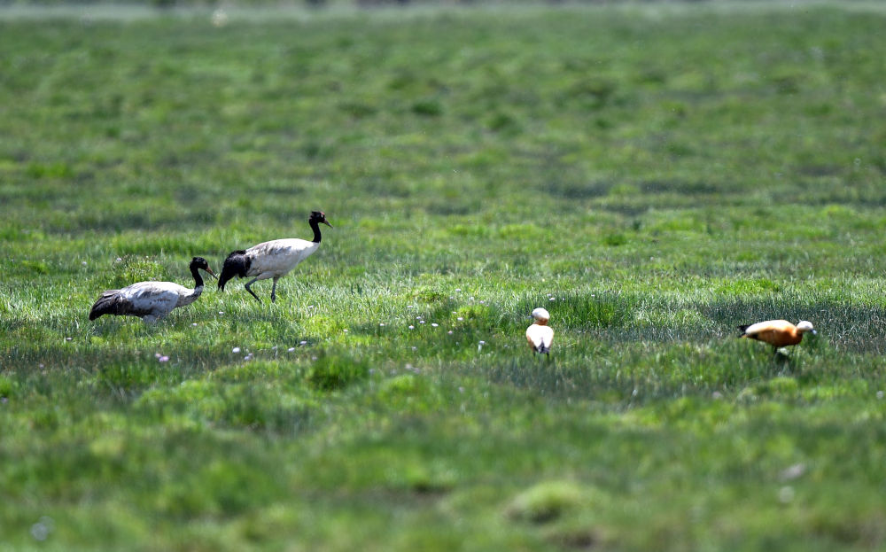2022年7月2日,兩只黑頸鶴(左一和左二)在青海隆寶國家級自然保護(hù)區(qū)內(nèi)活動。新華社記者 韓方方 攝