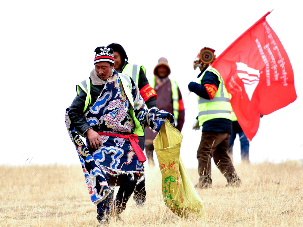 在三江源國家公園黃河源園區(qū),扎陵湖鄉(xiāng)生態(tài)保護(hù)站勒那村生態(tài)管護(hù)隊(duì)第七組的隊(duì)員在撿拾垃圾(2018年12月2日攝)。新華社記者 張龍 攝
