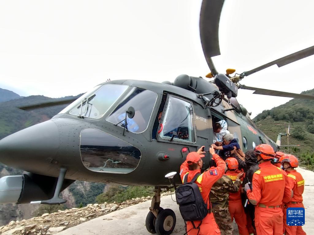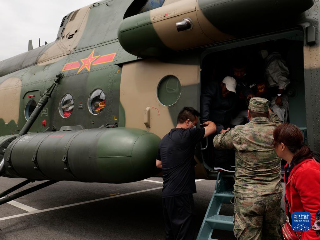 9月6日,西部戰(zhàn)區(qū)空軍某部緊急出動直升機(jī)在瀘定縣轉(zhuǎn)移群眾。新華社發(fā)(胡建軍 攝)