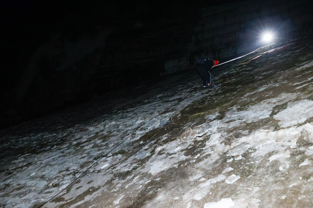 本以為沿著這條公路就可以走到得妥,轉(zhuǎn)過(guò)幾道彎,前面道路中斷完全無(wú)法通行,李祥帶我們到了真正可以下山的地方。這是一片分為好幾層的幾乎垂直的水泥邊坡,即便是應(yīng)急電筒的強(qiáng)光,也照不亮它的底。每層邊坡之間有鋼梯連接,我們要順著鋼梯爬下去,“山下會(huì)有車(chē)來(lái)接我們”,李祥淡定地說(shuō)。