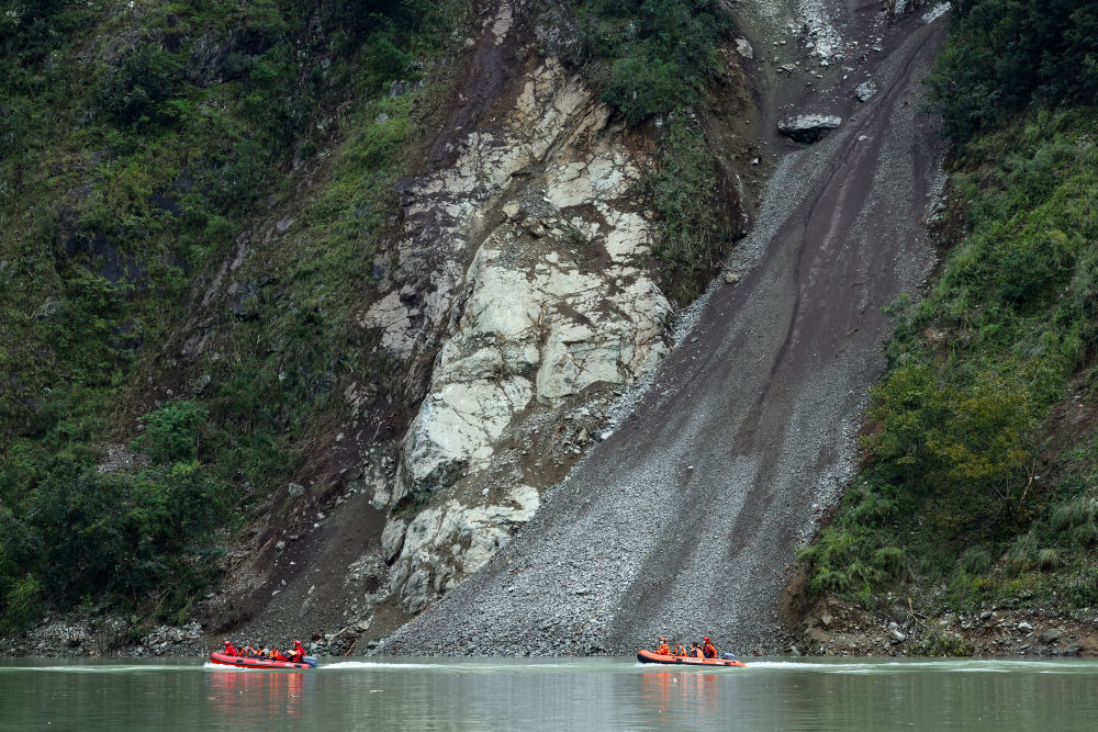 9月6日,救援人員乘坐橡皮艇經(jīng)水路,再爬山路進(jìn)入灣東村。