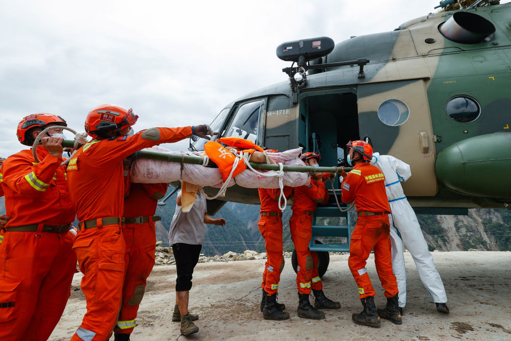 9月6日,救援人員抬著一名從灣東村疏散出來(lái)的受傷村民,準(zhǔn)備通過(guò)直升機(jī)將其運(yùn)出。