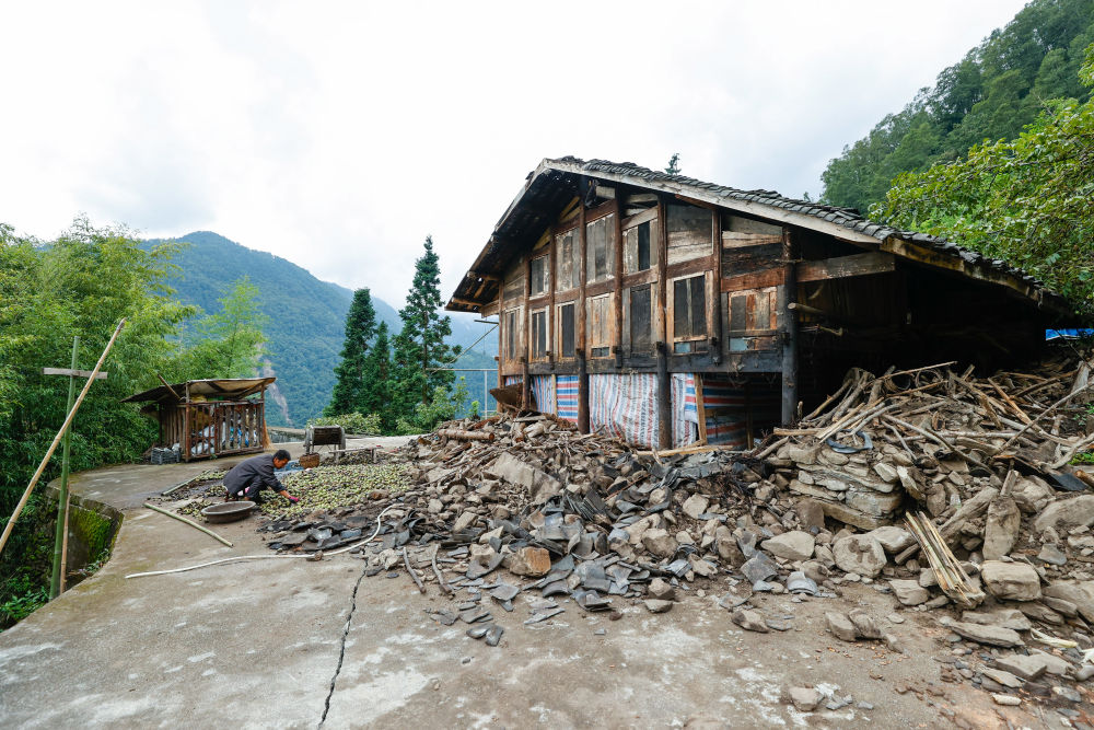 幾經(jīng)周折,終于抵達(dá)共和村最高的村民小組五組。眼前是村民陳松林家的房子,村民鄒先強(qiáng)在散落一地的碎瓦亂石旁幫他清理剛采摘的核桃。陳松林熱情地招呼我們吃核桃和水果。他是村里的種植大戶,種了100多畝核桃和七八十畝魔芋。往年,收個(gè)萬(wàn)把斤核桃不成問(wèn)題,今年只能收3000斤左右。“山垮得厲害,不敢上去收核桃。”陳松林不無(wú)遺憾地說(shuō),“但能收還是盡量要收一些?!辈凰惴孔拥膿p失,他家今年經(jīng)濟(jì)損失至少得有六七萬(wàn)元。