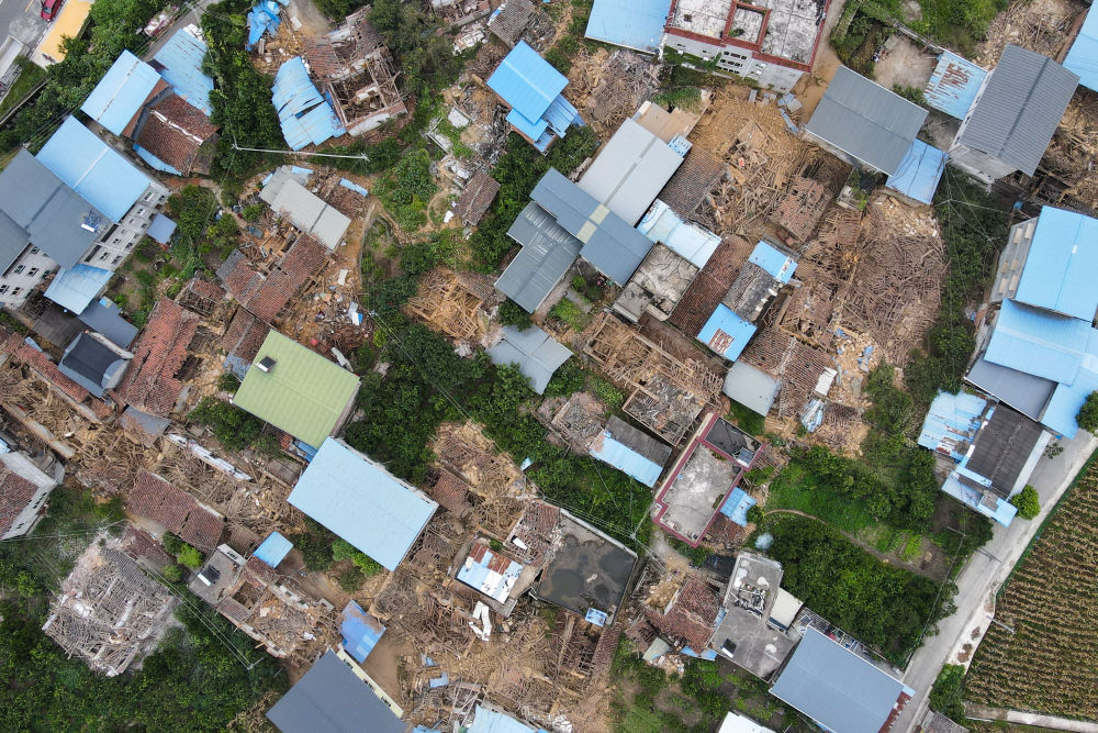 這張拍攝于9月6日的照片顯示石棉縣王崗坪鄉(xiāng)部分老舊房屋倒塌(無(wú)人機(jī)照片)。