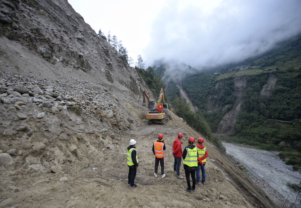 9月9日,搶險(xiǎn)人員在搶通磨西鎮(zhèn)附近道路。