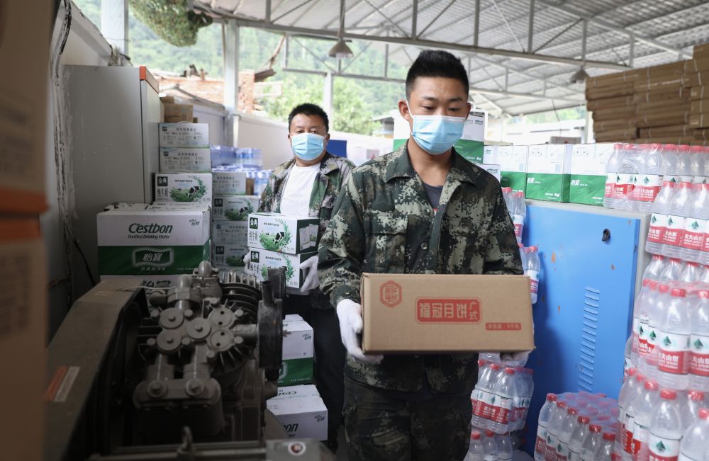 9月5日,在磨西鎮(zhèn),工作人員發(fā)放熱水和方便面。