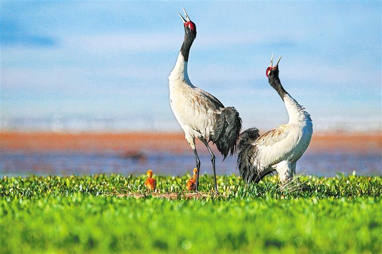 棲息在碌曲尕海濕地的國家一級保護動物黑頸鶴。新甘肅·甘肅日報通訊員 張勇