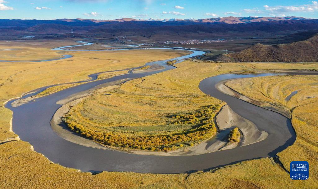 這是2022年10月19日在四川省阿壩藏族羌族自治州若爾蓋縣拍攝的熱曲河(無(wú)人機(jī)照片)。新華社記者 王曦 攝