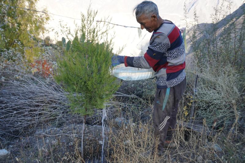 1950年出生在茂頂村木達水村民小組的丁爭,小時候多次看到雨季村里洪水成災,泥石流橫行,山體滑坡的場景。那時經(jīng)濟落后,村民日子過得苦。丁爭隨母親去頭人家放牛,由于天氣炎熱,饑渴難耐,母親就摘一個頭人家蘋果充饑,被頭人關了3天3夜。1957年,迪慶發(fā)展迎來新曙光,丁爭家分到了田、牲畜、果樹,當家做主人,從此過上了新生活。2007年,丁爭兒孫滿堂,家務事不用操心,他就想植樹造林、保護生態(tài),防止山洪暴發(fā)和水土流失,造福子孫后代。于是,他拿著家里的鎬、盆,踏上植樹造林的漫漫長路。 在植樹造林的初期,丁爭老人靠自家的舊桶舊盆給樹苗澆水。隨著旭龍電站、忠態(tài)水庫等項目進場施工,丁爭老人就撿拾一些舊水管、舊鐵絲,把水引到離幼苗最近的地方,以便澆水。用廢棄的鐵絲把樹苗固定好,以免風吹雨打樹苗飄搖致根系斷裂,影響生長。起初由于管理經(jīng)驗不足,澆水困難,1年種100棵樹苗,成活僅幾棵,但他沒有退縮,沒有喪失信心,查找成活率不高的原因,采取相應的改進措施,逐年提高了樹苗成活率。