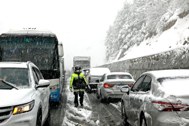 2月22日,大雪使白馬雪山路面積雪結(jié)冰,導(dǎo)致上百輛汽車擁堵滯留,交警冒著嚴(yán)寒疏導(dǎo)交通。[詳細(xì)] -