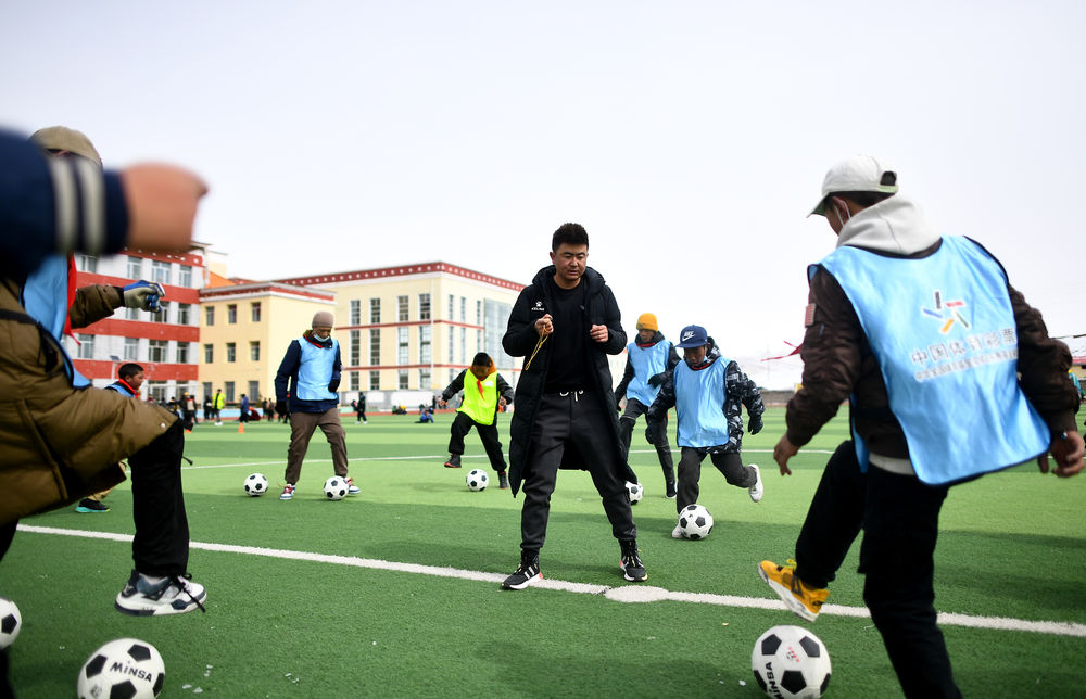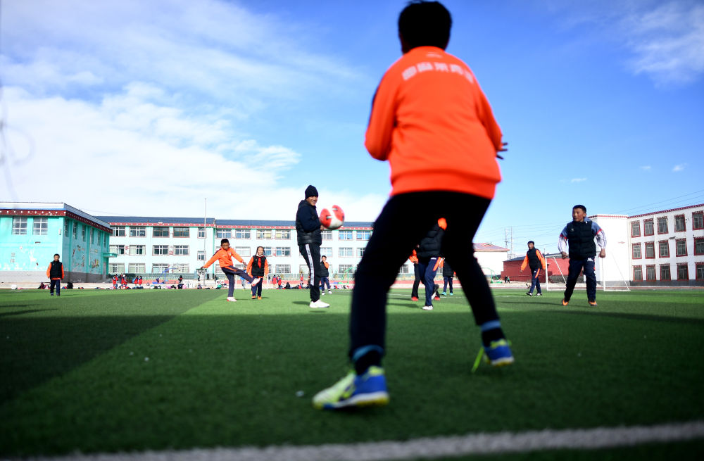 3月1日,在玉樹州曲麻萊縣第一完全小學,曲麻萊青訓隊球員白瑪加(左二)在訓練課上。新華社記者 張宏祥 攝