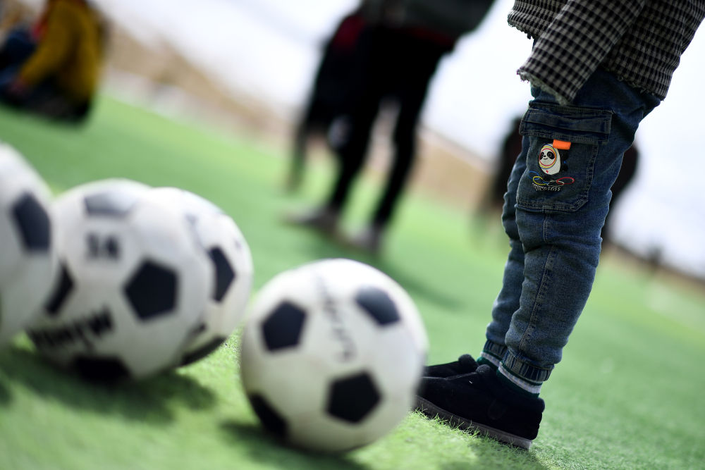 3月1日,在玉樹州治多縣,城南幼兒園小朋友旦增然桑(左一)在練習射門。新華社記者 張宏祥 攝