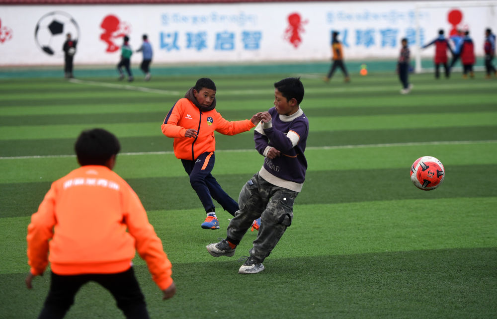 3月1日,在玉樹州治多縣,吉尕小學六年級學生羅松洋培(右二)在對抗訓練中射門。新華社記者 張宏祥 攝